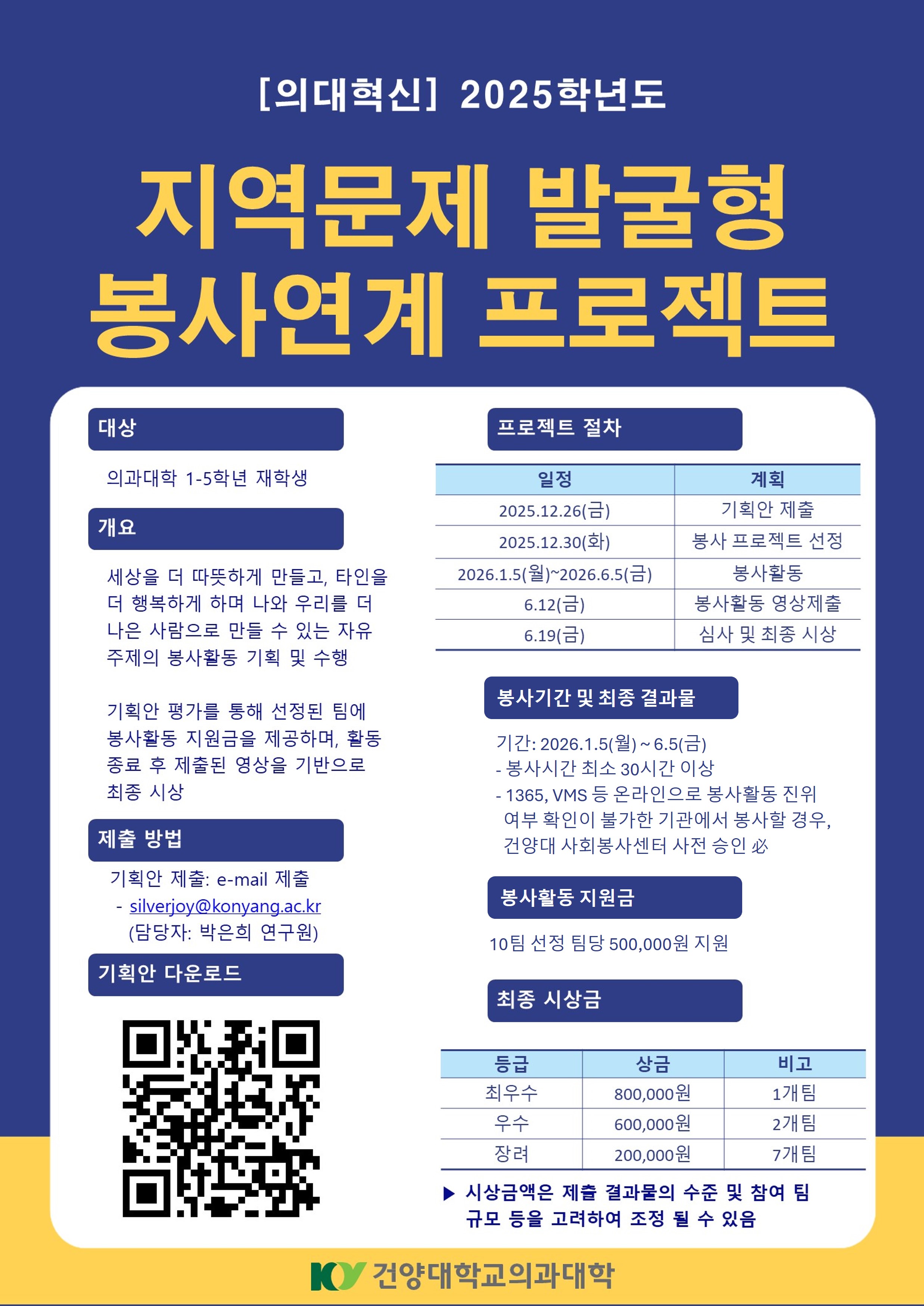 | 제목 | (※ 모집기간 연장) [의대 혁신지원사업] 지역문제 발굴형 봉사연계 프로젝트 참여학생 모집 | ||||