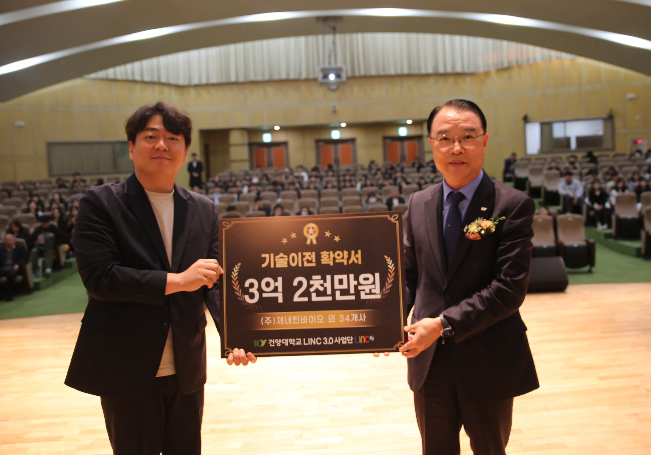 (주)제네틴바이오 임흥준 대표(왼쪽)가 협약기업 35개사를 대표해 홍영기 산학협력단장에게 3억2천만원 규모의 기술이전 확약서를 전달하는 모습.jpg