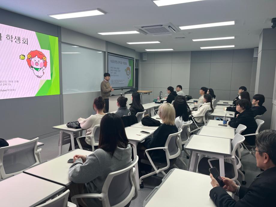 * 식품생명공학과 개강총회 안내⭐️ * 참석자: 모든 식품생명공학과 신입생, 교수, 학과 조교 * 장소: 경상학관 107호 * 일시: 2026.03.05, 15:50 * 내용: 학과 교수님 소개, 학사일정, 학생회 소개, 학생회비 등 총회 이후에는 교수님들과 학생들이 함께하는 저녁식사 자리가 마련되었으며, 맥주 빨리 마시기 대회, 손병호 게임, 표면장력 게임 등 다양한 프로그램을 통해 학생들 간의 친목을 다지는 즐거운 시간을 가졌다.
